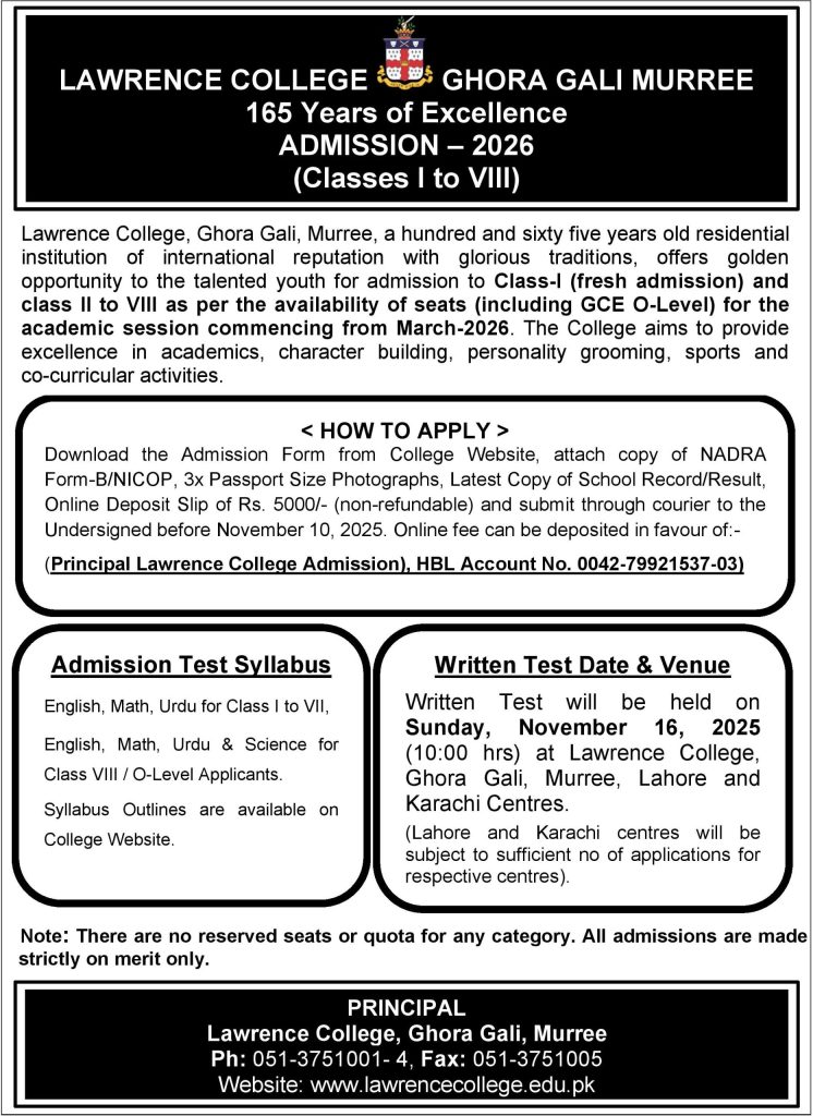 Tests are held in Pakistan at Lawrence College, Murree and Lahore.